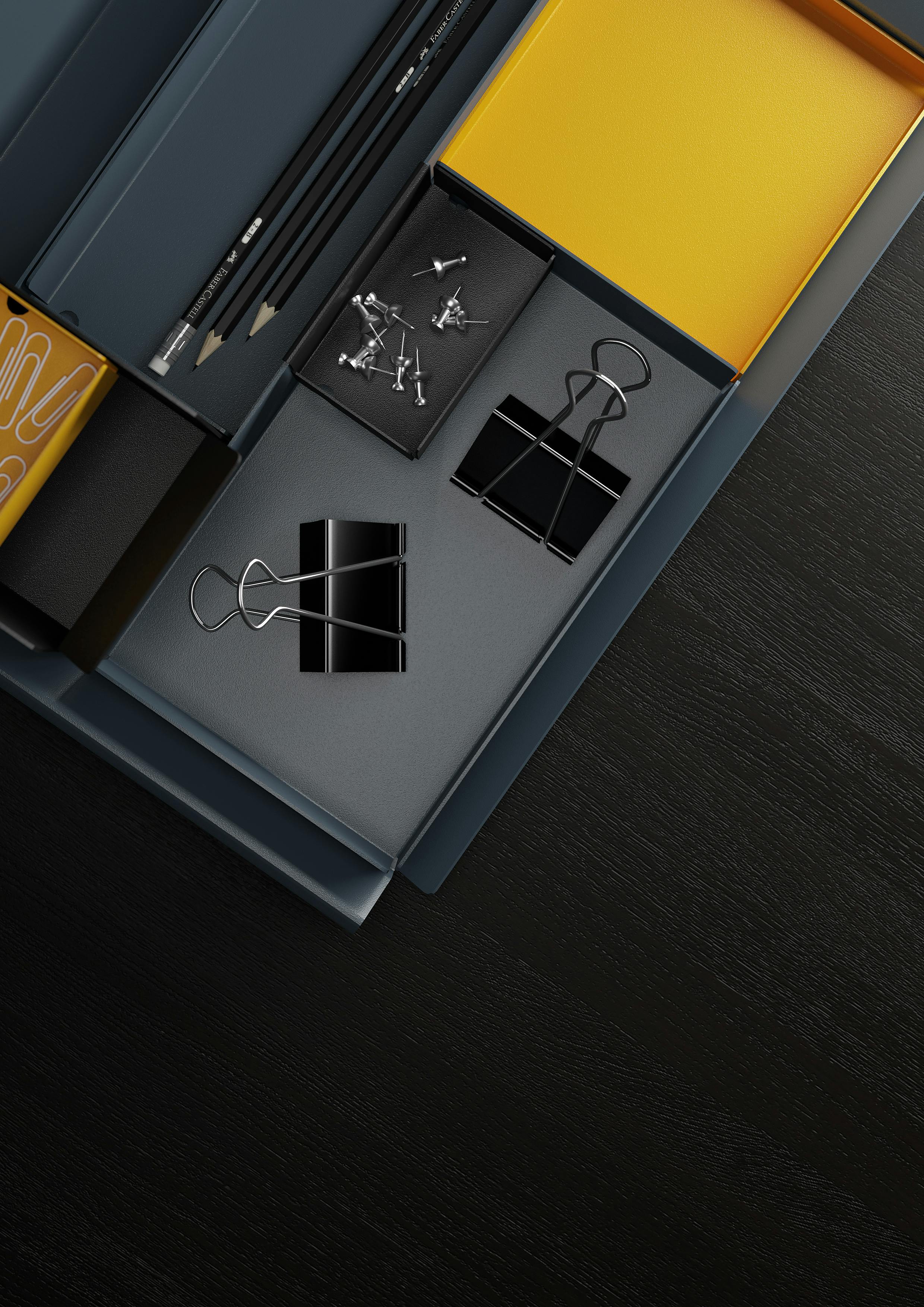 Jeu de six ou huit plateaux de rangement « agençables » en acier pour les accessoires de bureau.